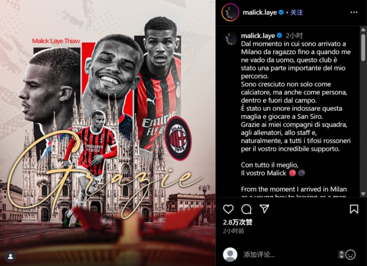 8月14日讯 夏窗佳夫从米兰转会纽卡,交往依然官宣。这名后卫在个东说念主社媒发文,向米兰告别。