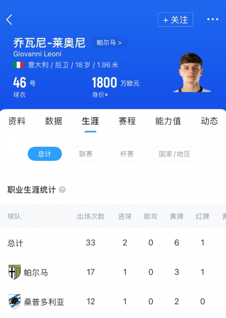 莱奥尼现年18岁,身高1米96司职中卫,球员现在德转估值1800万欧。