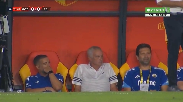 塔利斯卡失点后,镜头给到费内巴切主帅穆里尼奥。穆帅坐在替补席,形势凝重,看着场上若有所念念。