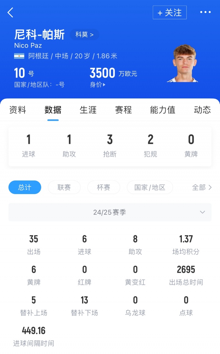 尼科-帕斯时年20岁,阿根廷籍中场,2024年8月从皇马卡斯蒂利亚600万转会至科莫。上赛季,他为科莫出场35场,获6球8助,现在其德回身价为3500万欧。