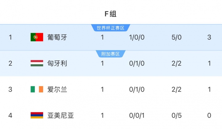 世初赛欧洲区,F组还剩5场比赛,葡萄牙的同组敌手包括匈牙利、爱尔兰和亚好意思尼亚。