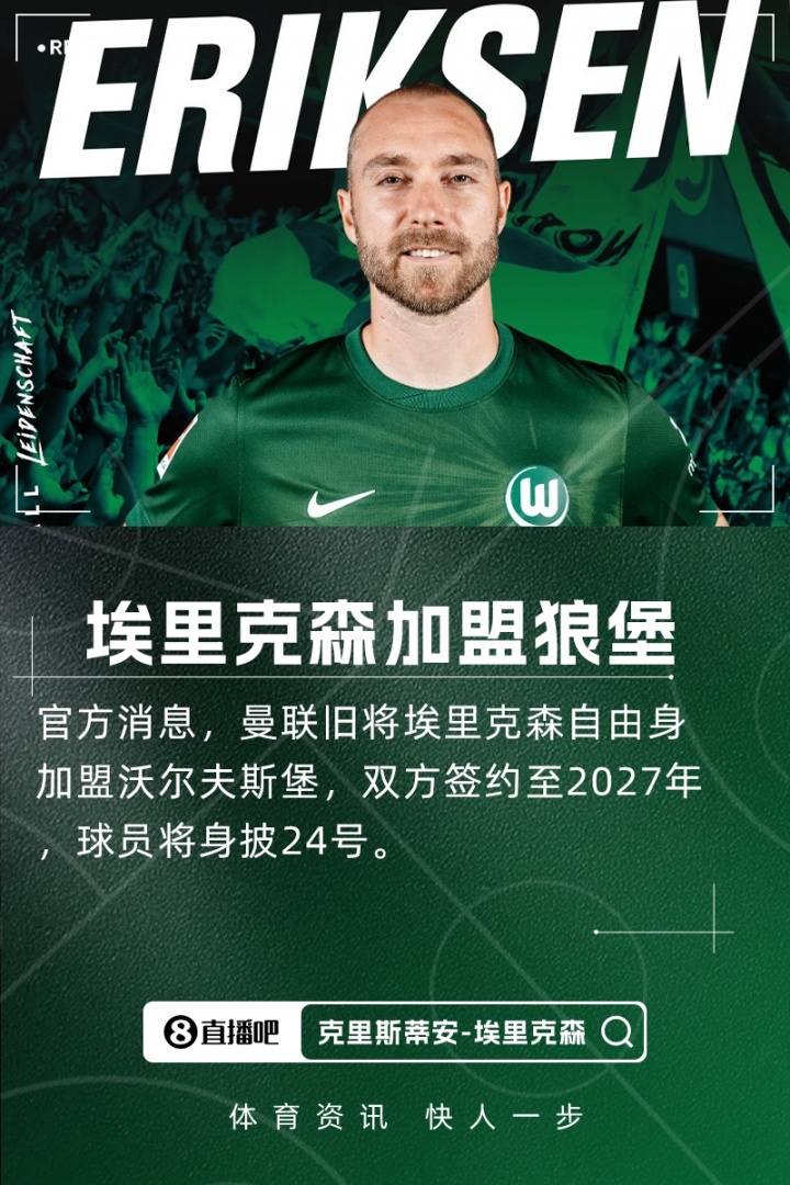 09月11日讯 官方讯息,曼联旧将埃里克森目田身加盟沃尔夫斯堡,两边签约至2027年,球员将身披24号。