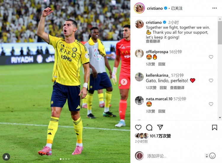 C罗社媒晒出赛后谢场的相片,配文:“咱们一皆交往,一皆赢!感谢群众的撑合手,让咱们不竭赢下去!”