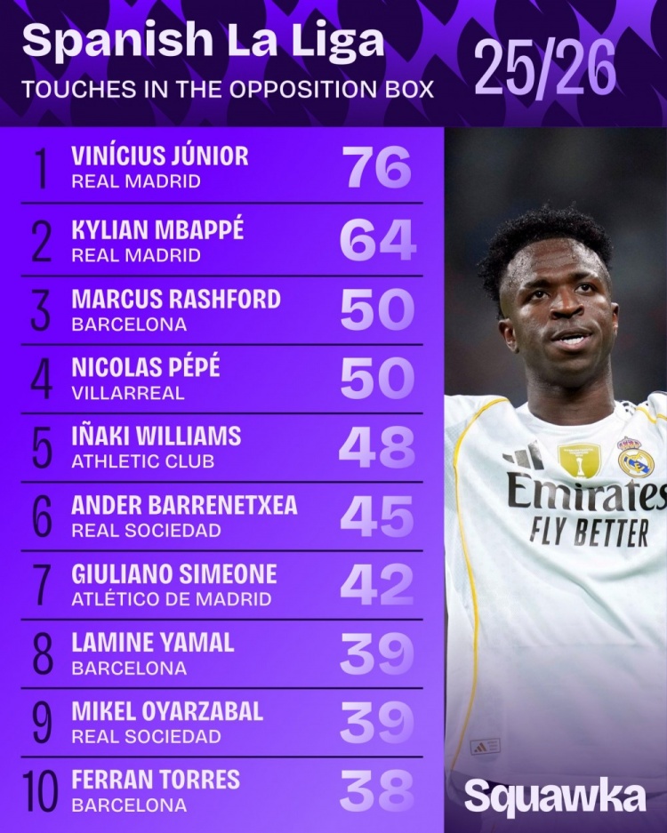 10月7日讯 日前,Squawka统计了本赛季西甲禁区触球次数排名,维尼修斯76次居首,姆巴佩64次序二。