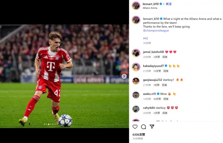 你的位置:英超直播 > 中超 > 首发轰寰球波+获MVP!17岁卡尔社媒牵挂:在安联球场的精彩通宵