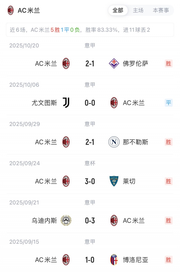 米兰5胜1平1负暂以16分领跑意甲,比萨3平4负名次垫底。