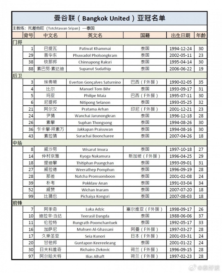 附曼谷联亚冠名单: