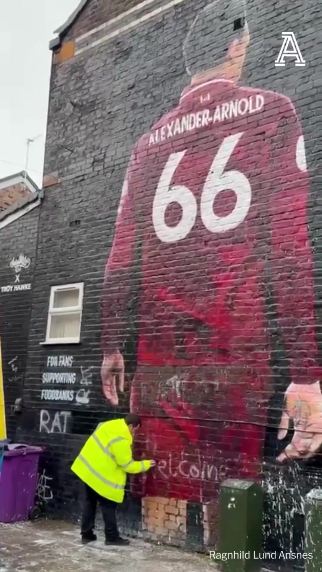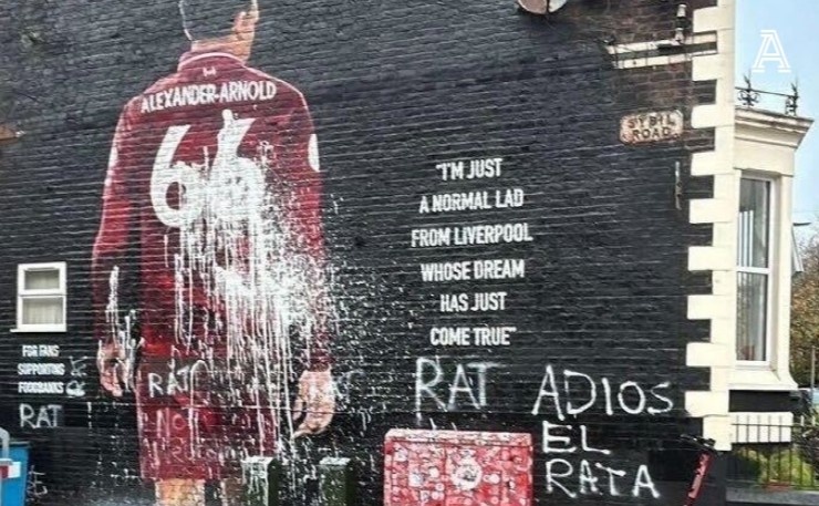 本周中的欧冠皇马将客战利物浦,阿诺德重返安菲尔德。赛前,阿诺德在利物浦当地的一处壁画遭到了球迷的污损。