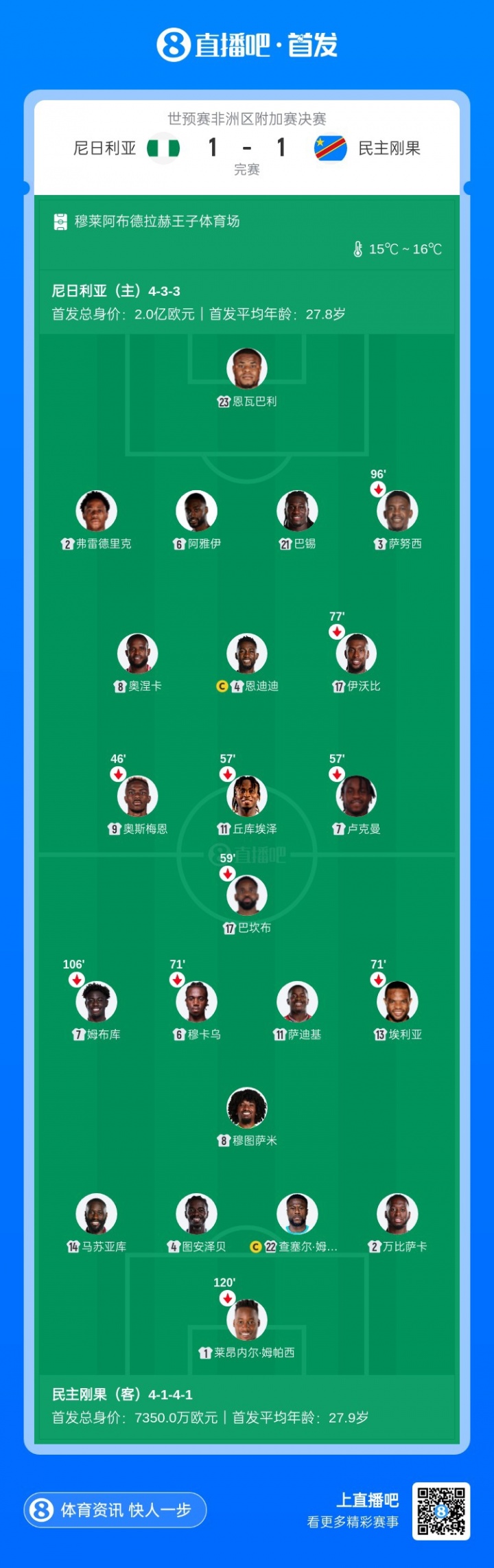 11月17日讯 世初赛非洲区附加赛决赛,尼日利亚点球大战不敌民主刚果,相连两届无缘天下杯。比赛中,尼日利亚主帅的换东谈主操作激勉热议。