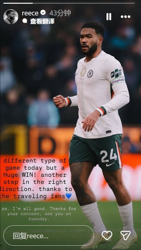 11月23日讯 在切尔西2-0伯恩利的英超联赛中,里斯·詹姆斯半场被换下,他在赛后更新外交媒体报吉利。